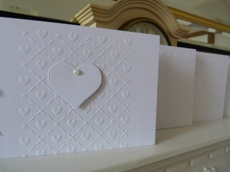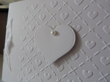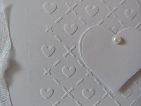 This is a pack of 5 identical cards which are blank. Consisting of quality pristine white card which has had a cross stitch and heart pattern embossed with a large heart mounted in the centre finished off with a pearl. Further decorated with a white organza bow.