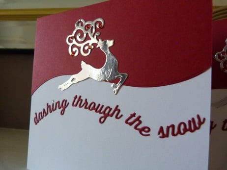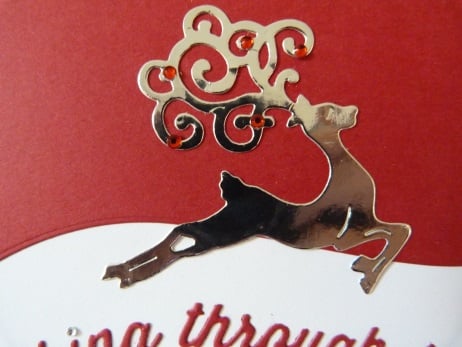This is for a pack of 4 identical cards. Consisting of quality pristine white card which has a top half cut from bright red card. A beautiful prancing stag has been die cut from silver mirri card and his antlers decorated with red rhinestones. Finished off with the words dashing through the snow die cut from bright red card