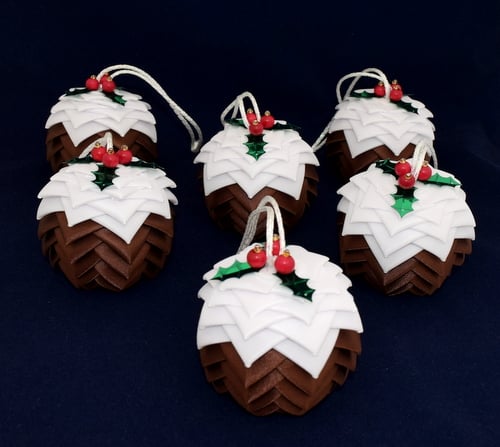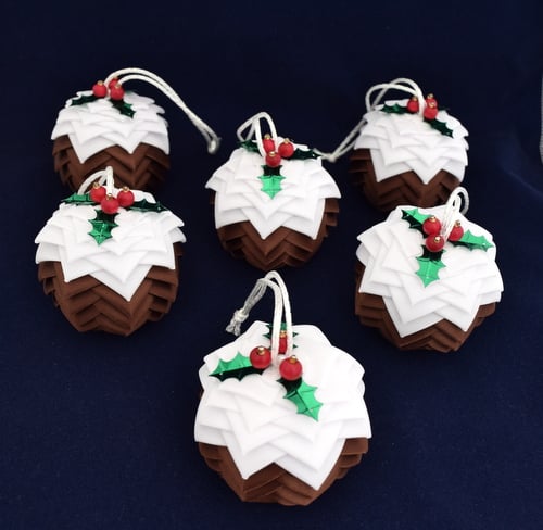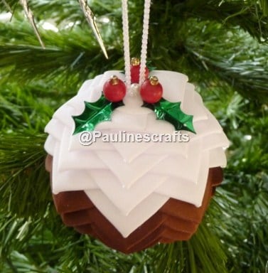 This lovely handmade Christmas pudding hanging Decoration is just perfect for any Christmas tree. It's made from Brown and White ribbon, this is cut to size and pinned onto a 6cm polystyrene ball with small sequin pins. the top is then decorated with Green sequin Holly leaves and Red Berries are also attached.