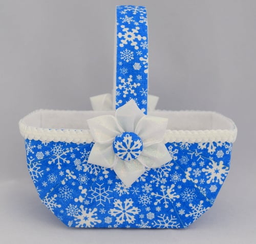 This lovely Handmade Novelty Christmas Gift basket is perfect to decorate your coffee table at the festive time and is made from a lovely snowflake print fabric in Blue and White. Its then reinforced with Interfacing to make them strong and sturdy and then finished off inside with a white felt. At each end of the handle I've attached a handmade flower made from a white ribbon with a cover button in the same fabric and placed in the center. These Novelty Baskets can either be filled with your favourite chocolates or fir cones. They make perfect gifts too for someone who like unusual and unique presents.