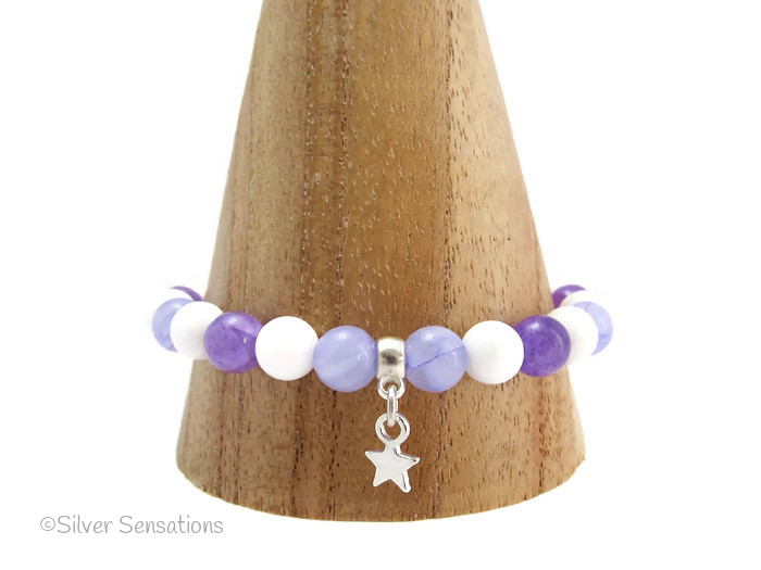 This pretty Silver Plated star charm fashion stretch bracelet has purple & white semi precious gemstones.