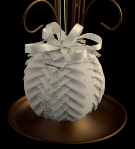 This lovely White and Silver Christmas Bauble is handmade using a Polystyrene Ball, Sequin pins and 2 types of ribbon, 1 in a plain ribbon and the other in a White and silver Print. The ribbon is cut to size depending on what size ball been used. Once the ribbon is cut it is then folded and pinned onto the Polystyrene Ball using small sequin pins to produce this Christmas Bauble. They look great on Christmas Tree's and will make a lovely gift for someone special.