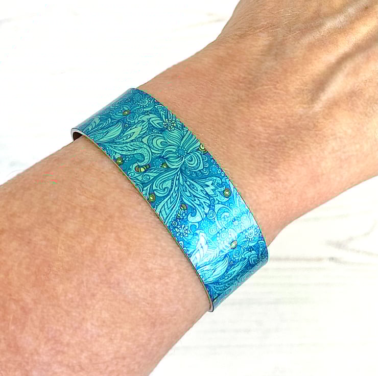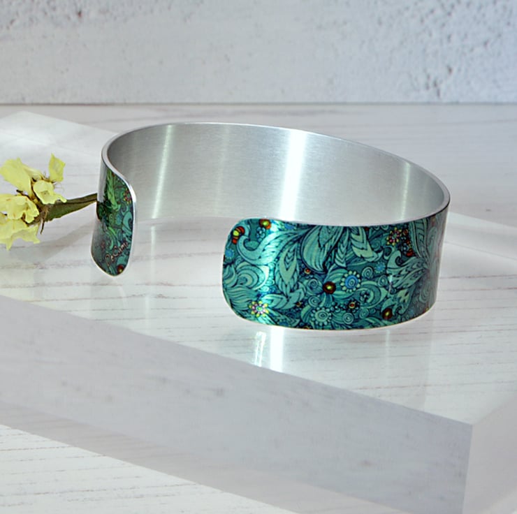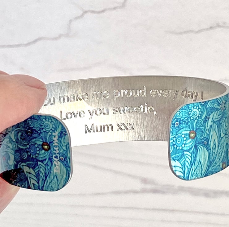 Handmade cuff bracelet with an intricate floral design in a pretty teal colour. An ideal gift for someone who likes something a bit different. Matching necklace and earrings available. In addition, for a small extra fee, a personal message can be engraved on the reverse (Optional)