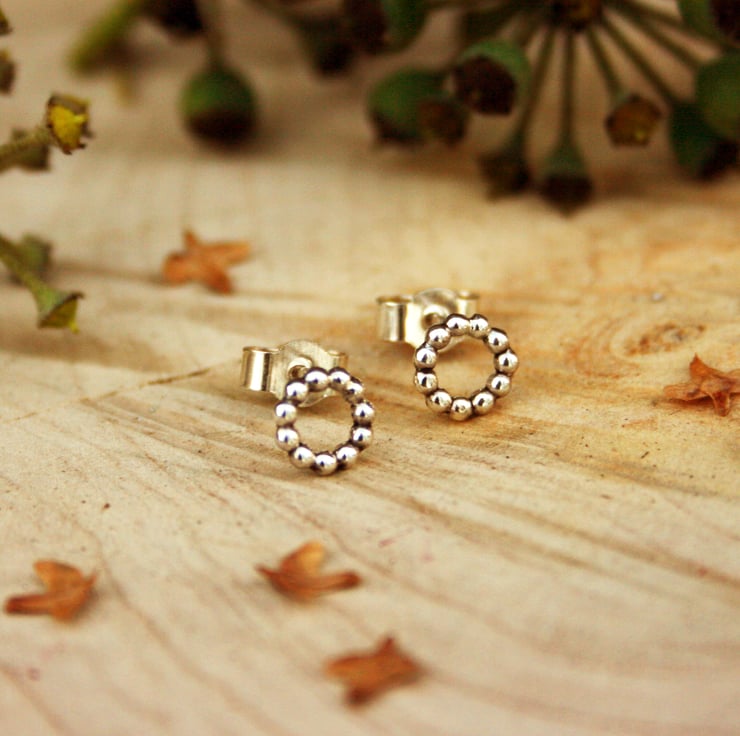 The earrings are made up of miniature solid balls of silver, soldered together and formed into a tiny circle. The circle is then attached to a silver earring post to complete these dainty studs.
