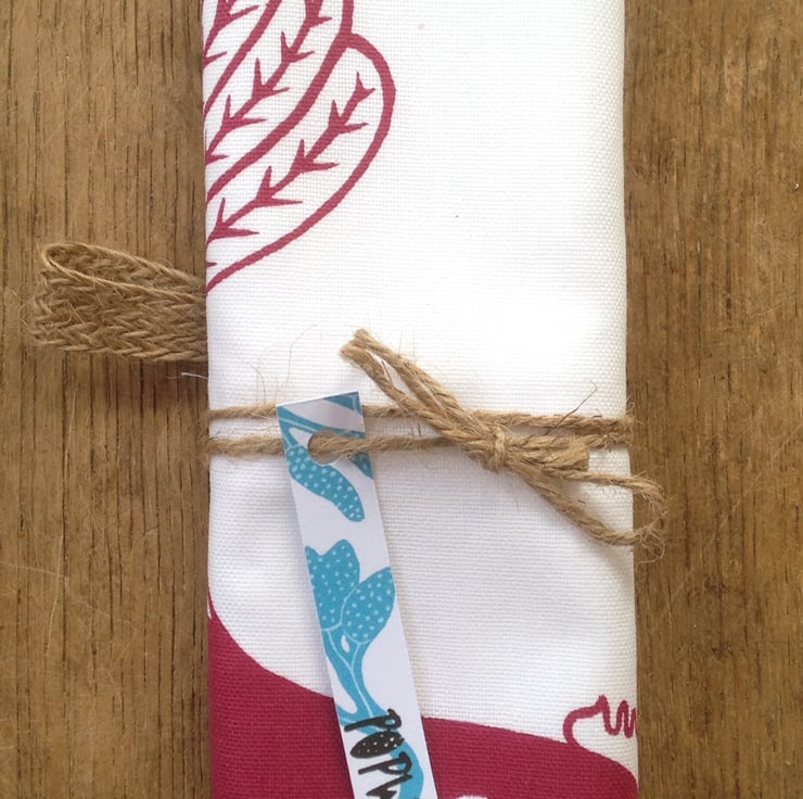 Hand screen printed 100% cotton tea towel featuring an original chicken design. The chickens are printed in a rich red colour to add warmth to your kitchen decor. A jute ribbon has been sewn to one corner of the tea towel to create a handy hanging loop so your tea towel can be hung over a railing or from a hook.