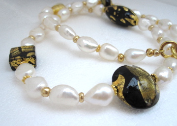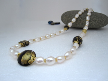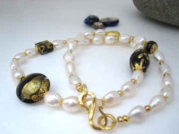 Mr Silverhares took me to Venice (before he was formally Mr Silverhares) and I fell in love with the city, (him obviously) and Venetian glass. I watched the makers and was inspired to learn to make glass myself and study the history of this rich luxurious material. So every time I see Murano glass, I smile. The combination of black, gold & pearl is a truly luxurios mix. Wonderfully opulent a modern statement piece.