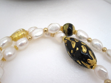 Stunning Venetian Murano glass and Pearl necklace mounted on Gold plated Sterling silver non fiddly Hooks. The pearls have exceptional lustre.