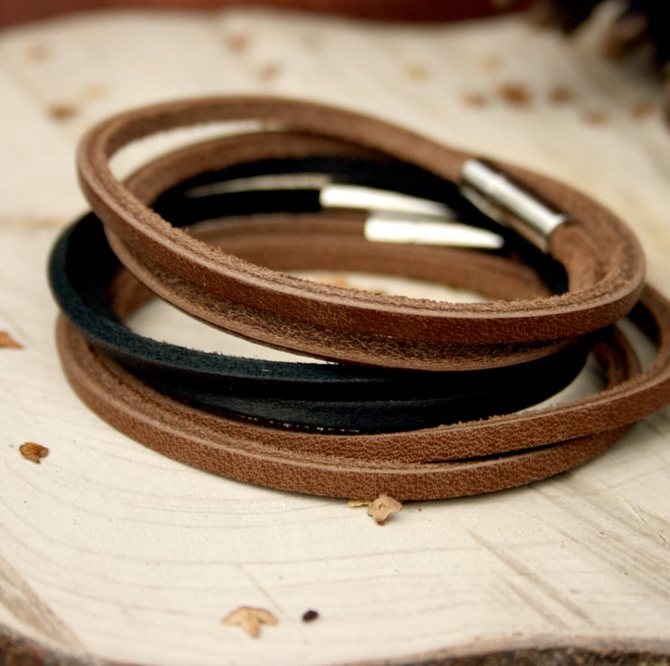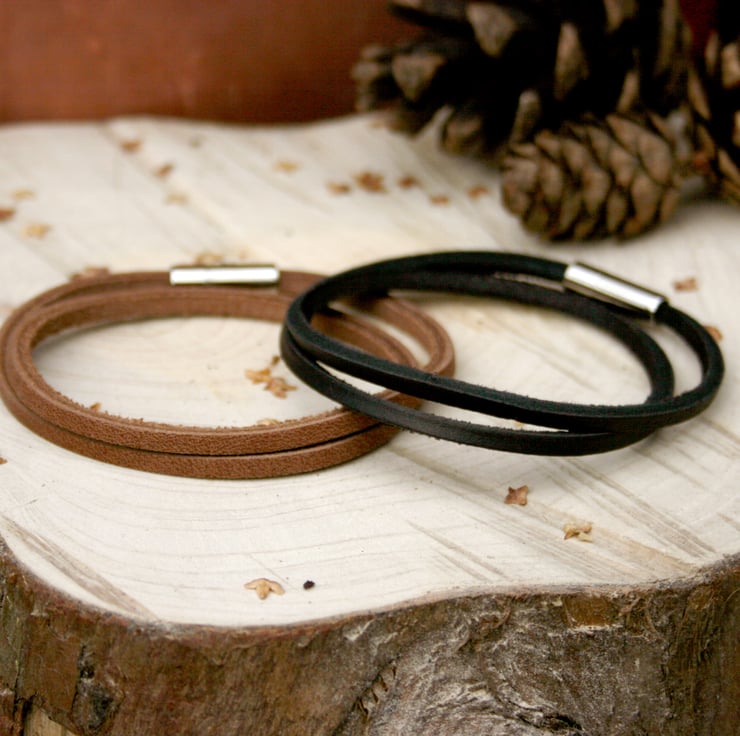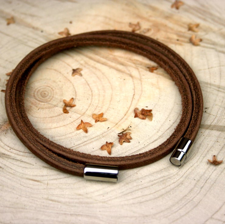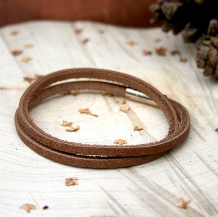 Crafted from brown flat leather this stylish bracelet for men wraps around the wrist twice and is finished with a simple stainless steel magnetic clasp.