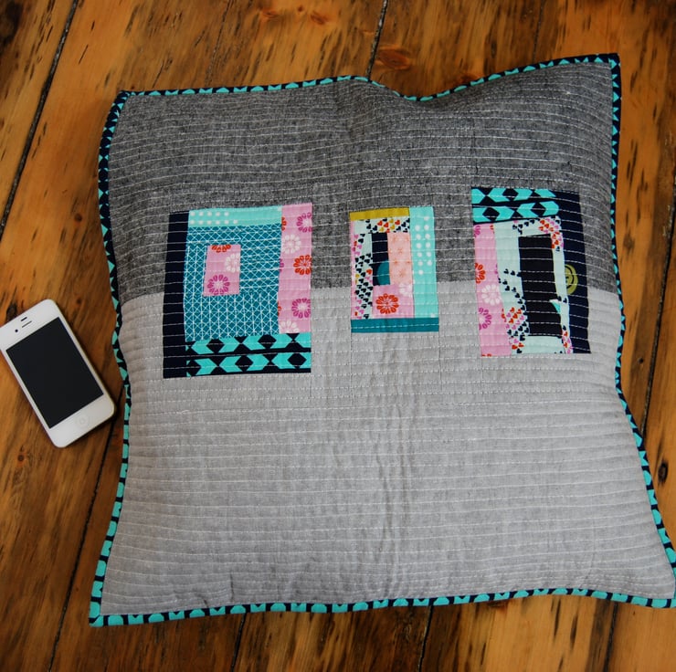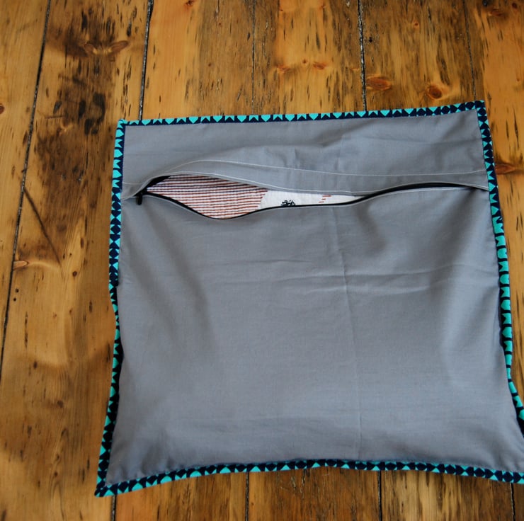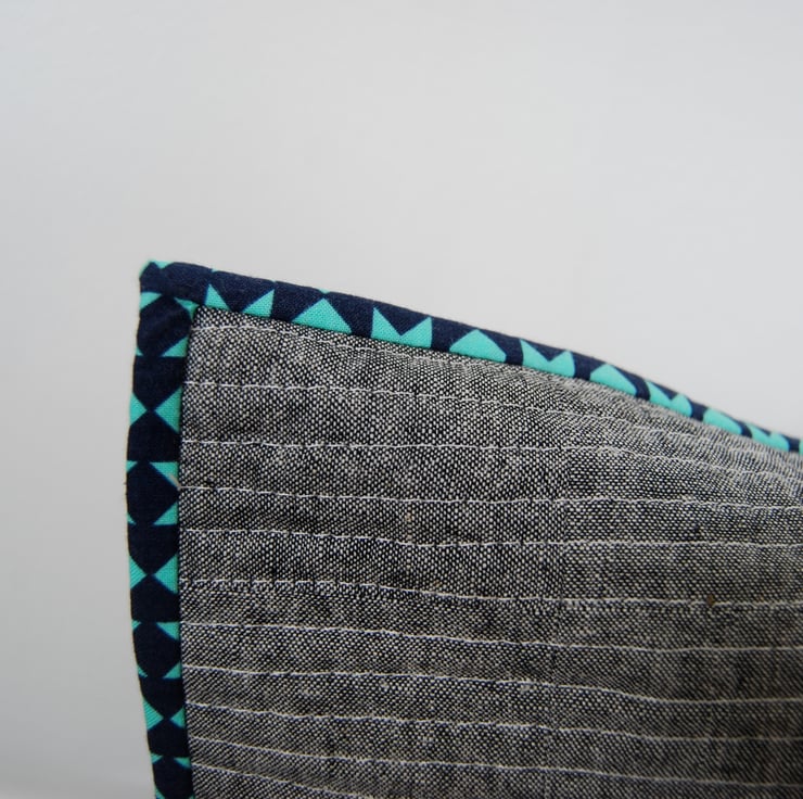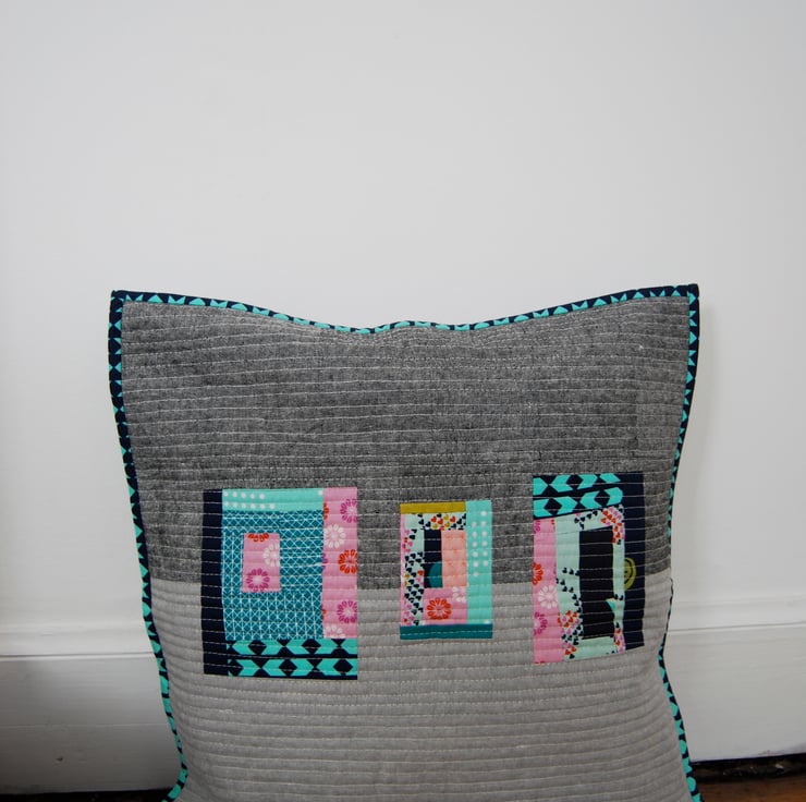A modern spin on the patchwork cushion. Made with designer cotton and steel fabrics and an essex linen background. The cushion cover is 17" square and actual cushions from Ikea or John Lewis will fit inside it perfectly. Featuring a hidden zip enclosure on the reverse. The cover is quilted onto 100% cotton batting and bound by hand. This is a well made and robust item which will last for many years. Machine washable.