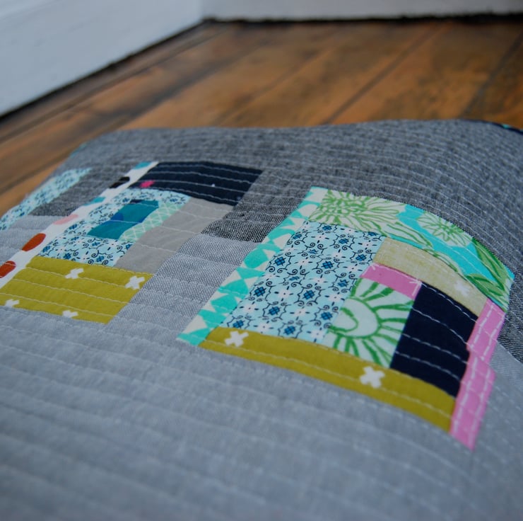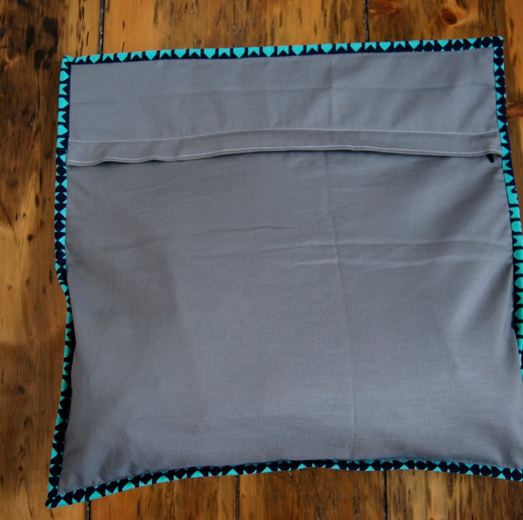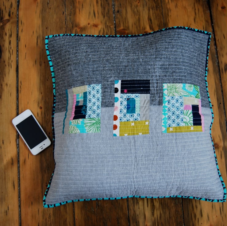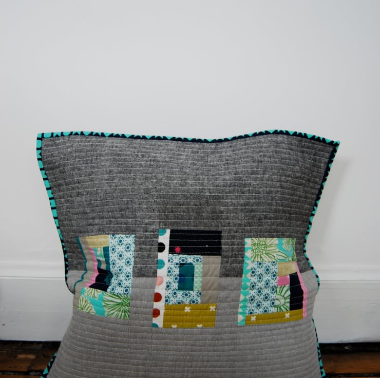 A modern spin on the patchwork cushion. Made with designer cotton and steel fabrics and an essex linen background. The cushion cover is 17" square and actual cushions from Ikea or John Lewis will fit inside it perfectly. Featuring a hidden zip enclosure on the reverse. The cover is quilted onto 100% cotton batting and bound by hand. This is a well made and robust item which will last for many years. Machine washable.