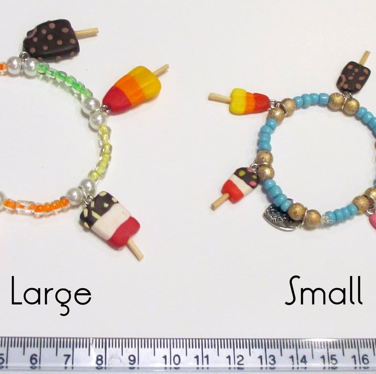 Created with three colours of seed beads orange, green and yellow, or the blue for the classic version. The 5 ice lolly charms are as shown in the photo complete with authentic wooden sticks!