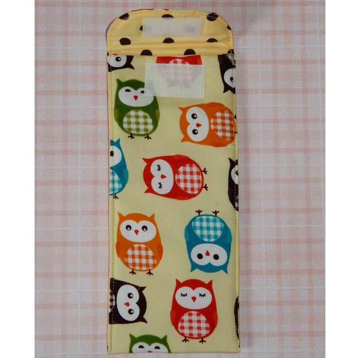 A handy case for your glasses or sunglasses.This is made from a cotton print fabric featuring owls, with a toning lining. It also has a layer of wadding for protection. The case fastens with velcro.