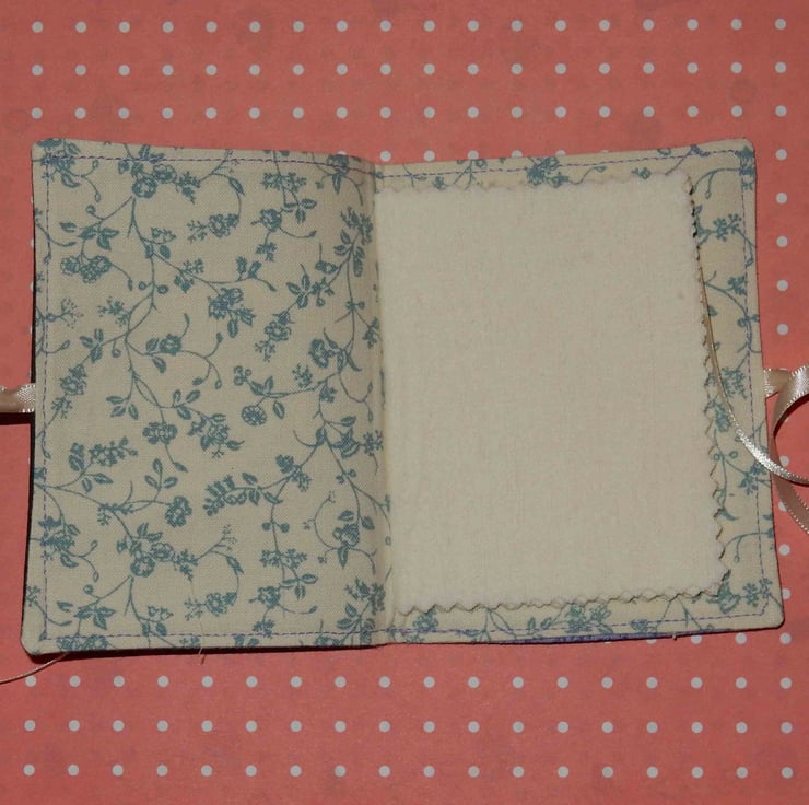 This needle case measures approx 4.5 x 3 inches and is made from a pretty lilac fabric featuring a cat on the front and the back. It is lined in a toning print fabric and has four flannel leaves for your pins and needles. It is fastened with ribbon ties, which can be tied right round the case for protection in a bag.