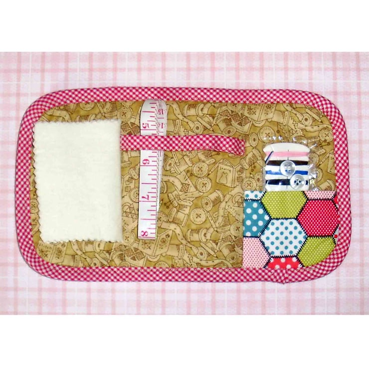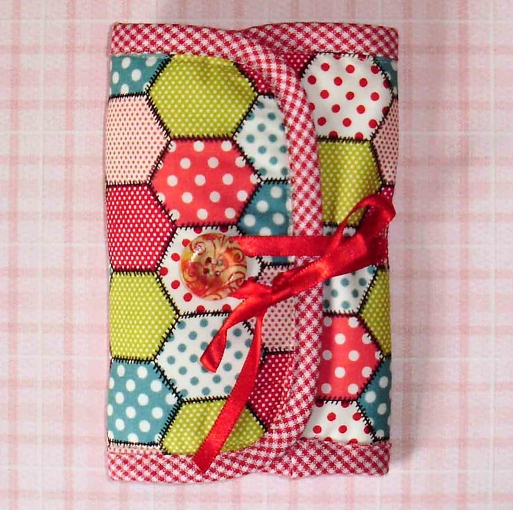 This sewing set combines a needle case with space to store you scissors, unpicker etc. It comes complete with a tape measure and mini sewing set as shown in photo, and has space for scissors etc. and flannel leaves for your pins and needles. It fastens with a ribbon to tie around the pretty button. It measures approx. 9.5 x5.5 inches when opened (see second photo) and 3.5 x5.5 inches when closed. This is made from a delightful fabric with a hexagon patchwork effect and a cotton reel fabric lining.