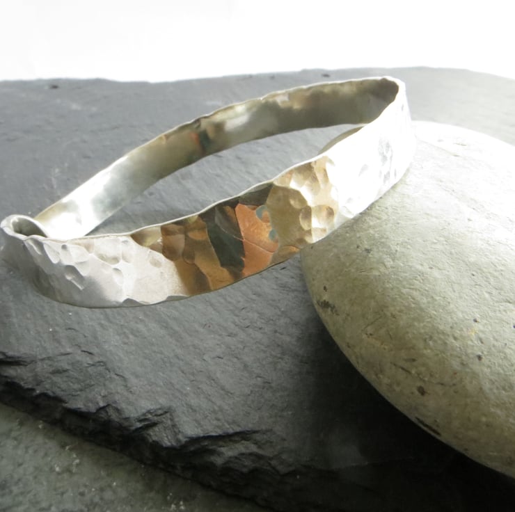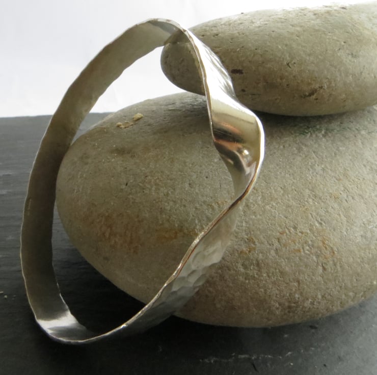 This mobius bangle has a lovely dimpled texture and highly polished surface which sparkles in the light when worn. It also looks nice as a stacking bangle with other bracelets. The beaten surface was acheived by hammering the bracelet on a mandrel, the edges were left uneven but smoothed of any rough parts.