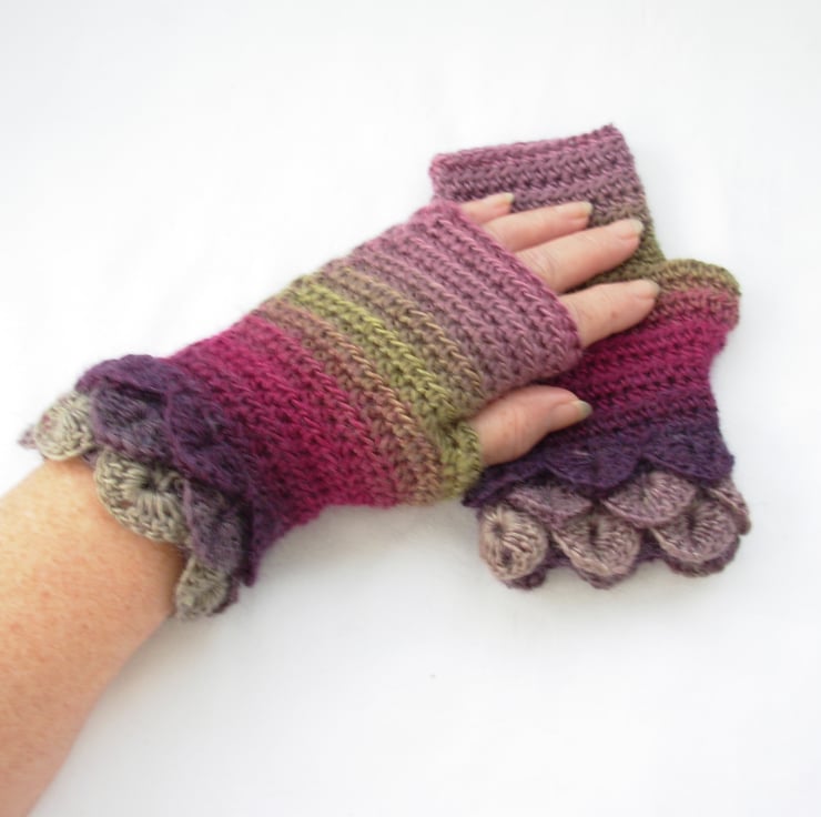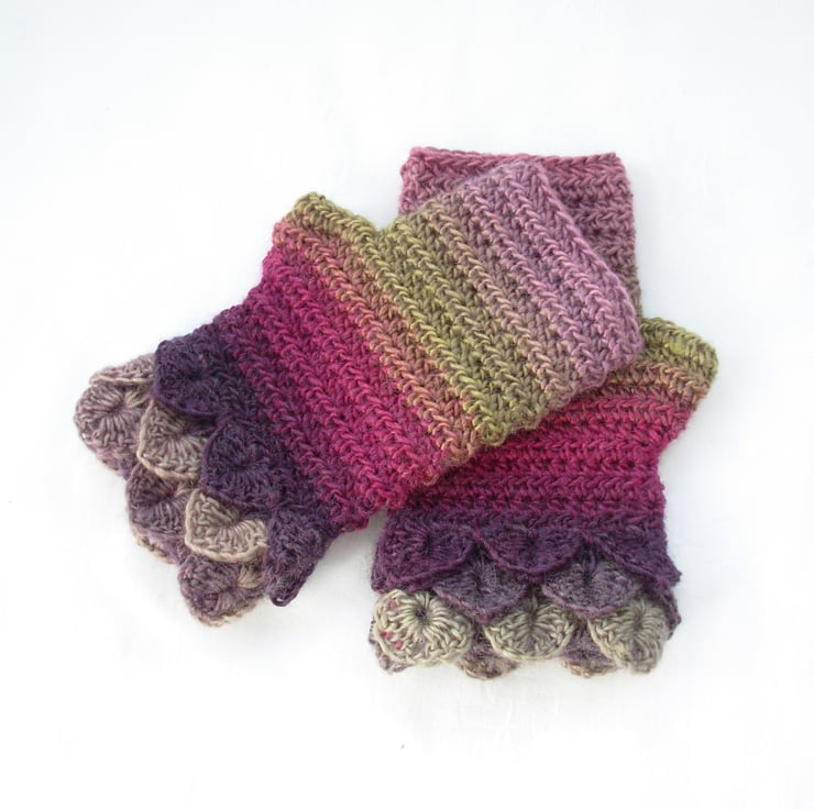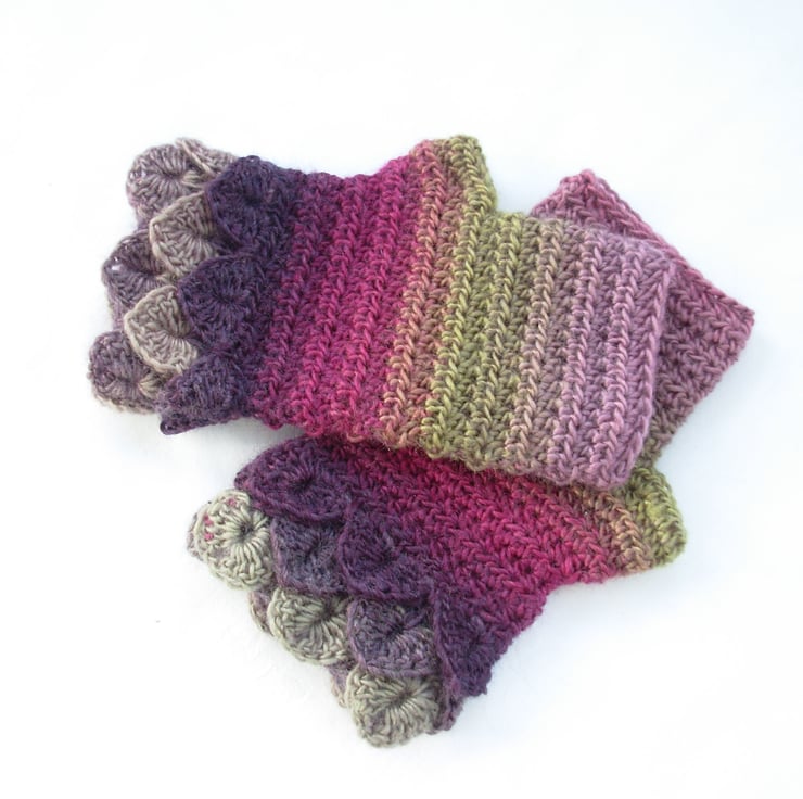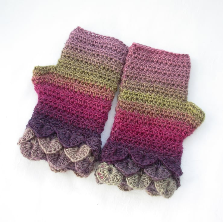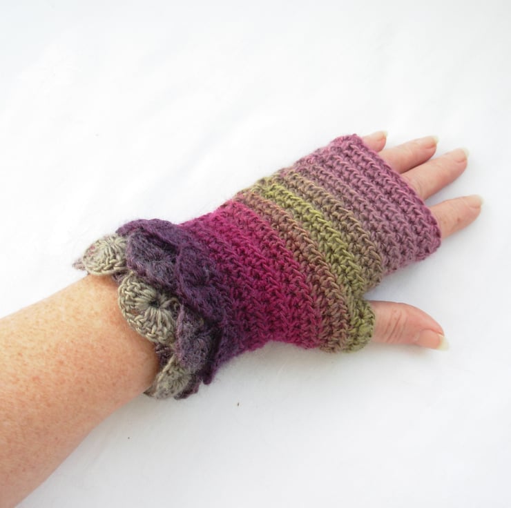 These adults fingerless mitts cum wrist warmers warmers have been crocheted in a soft wool and acrylic double knit multi tonal yarn. Green, pink and purple.