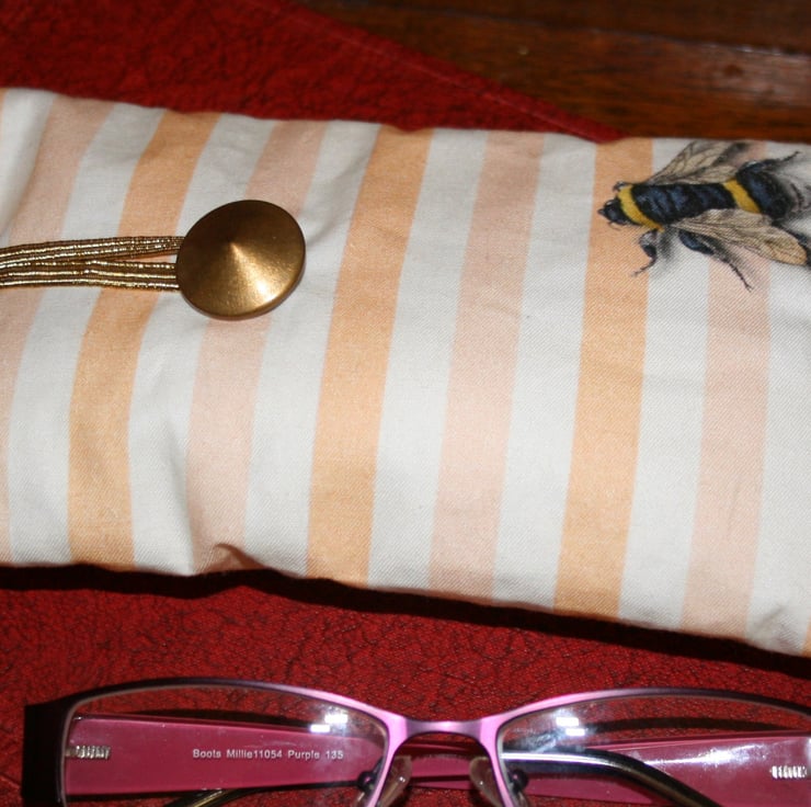 I have added 2 recycled buttons and gold elastic so you can use it as a case to put your glasses case in to stop it getting scratched. Ive added a second button so you can make it smaller to hold something like a phone or make up.