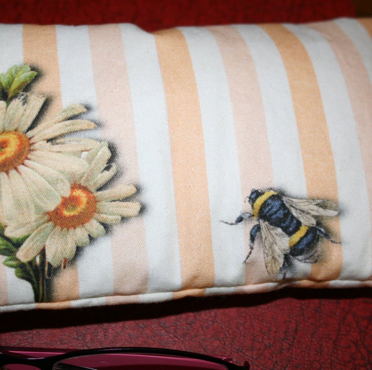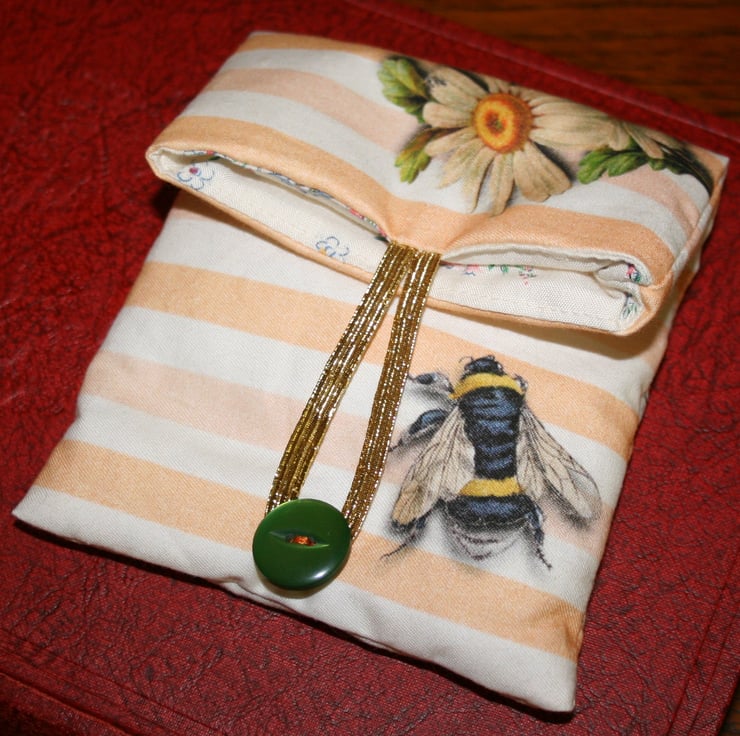 I have designed and made this one of a kind item using a stripey orange and white background, in the foreground I have added a cute little bee and an illustration of a daisy. This fabric was printed by a UK company onto cotton.