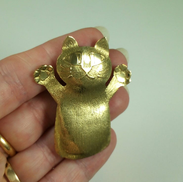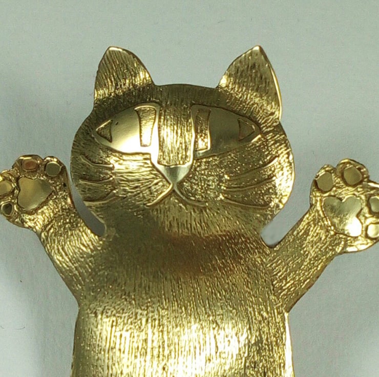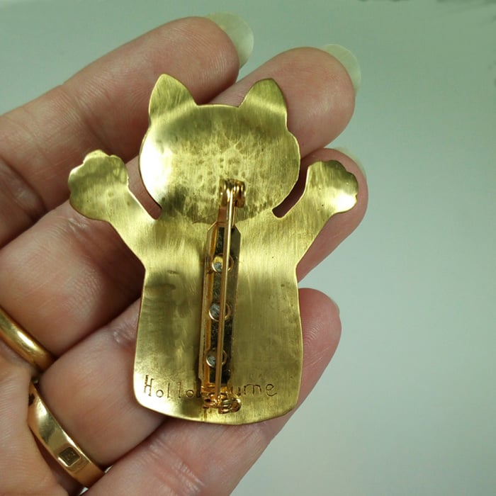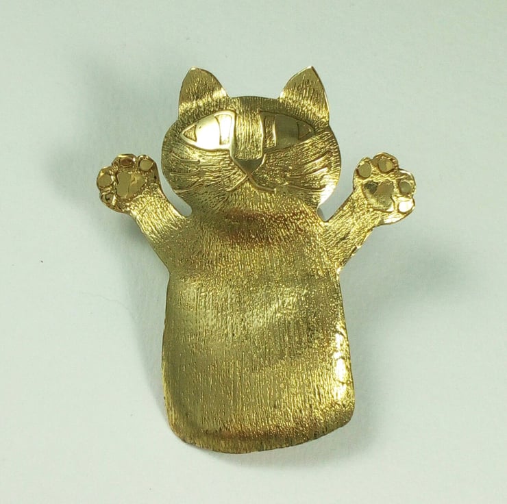 This was made from sheet brass, hand sawn, beaten to shape, etched with a hand drawn face and paw prints then engraved .