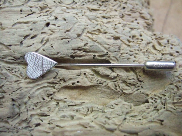 The heart is made from Sterling Silver sheet which has been rolled with a leaf skeleton to produce this surface decoration.