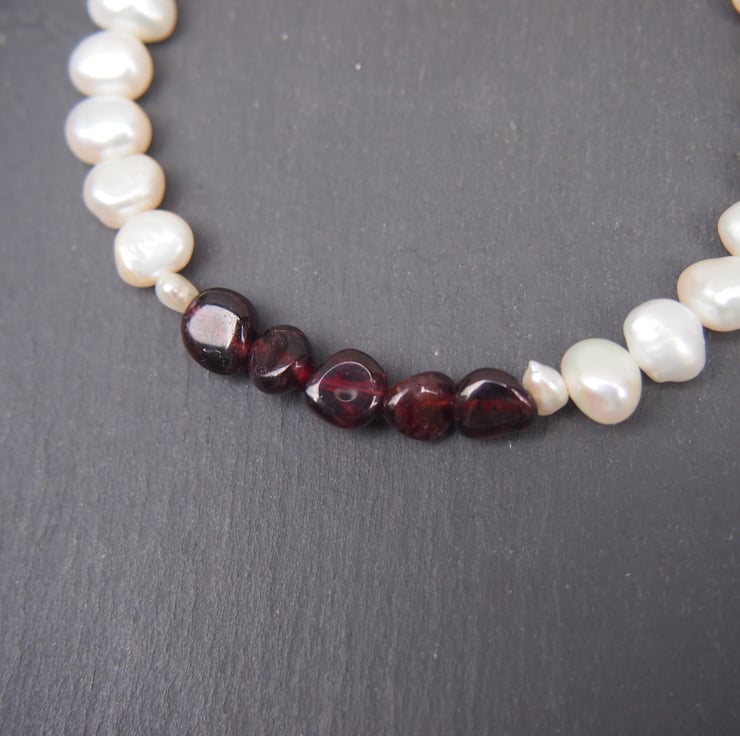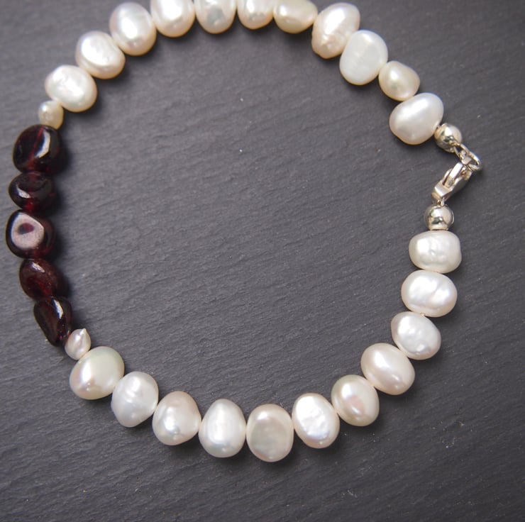 Pretty bracelet of small "baroque" freshwater pearls with an inset section of garnets and a sterling silver clasp