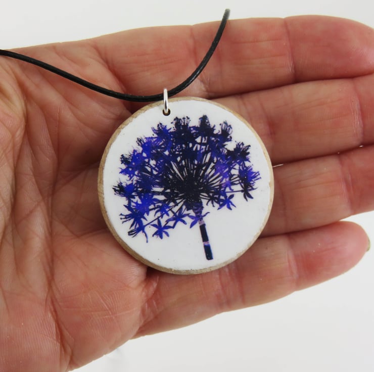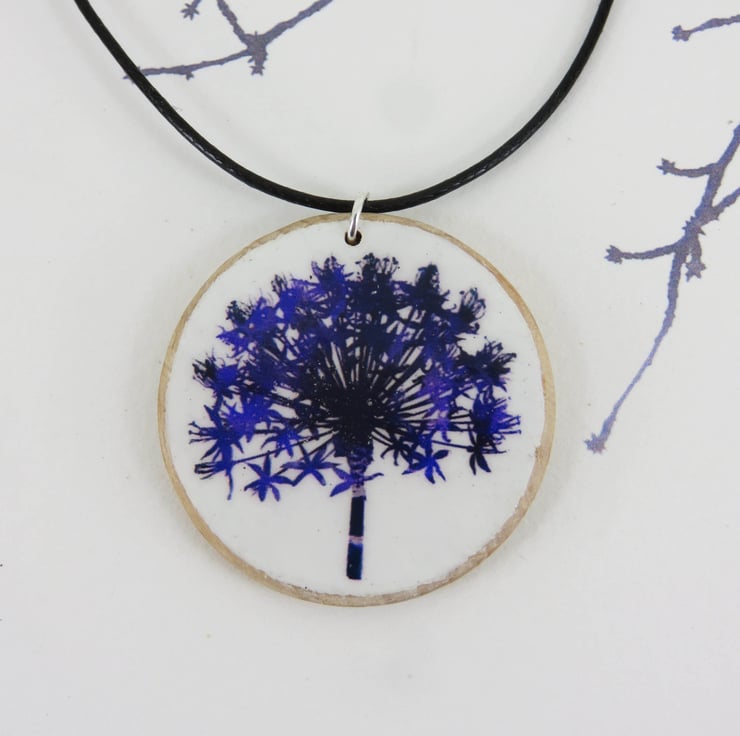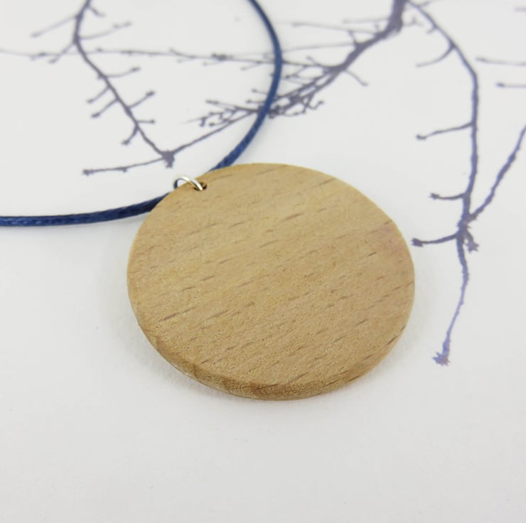 This round wooden shape has been decorated with one of my colourful, intricate botanical designs. it measures 3.8cm wide. The pendant hangs on a cord with a silver plated lobster clasp, approximately 45cm long.