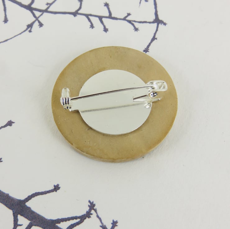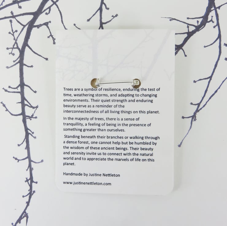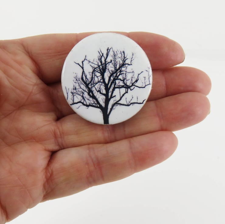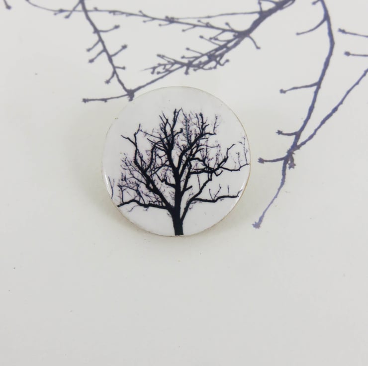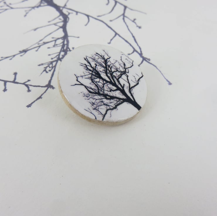A dramatic winter tree has been applied to a round wooden disc, 38mm in diameter. It has a silver clasp on the back for attaching to your clothes. It is attached to a card and ready to be a unique gift to a friend.