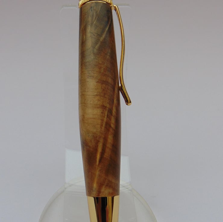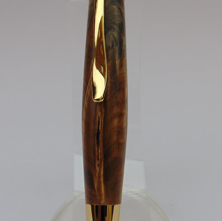 This twist mechanism pen has been made using stabilised Buckeye Burl from USA. The wood is preserved in resin to provide a more stable product. The wood has been turned, sanded and polished, before affixing the pen mechanisms.