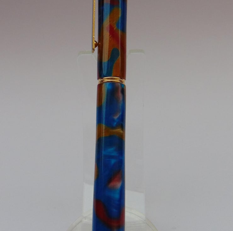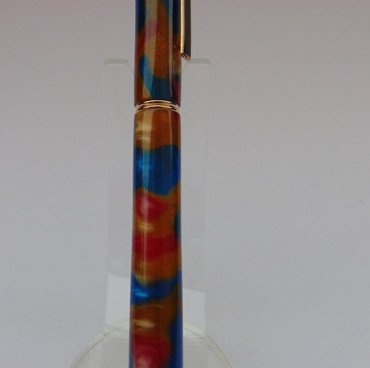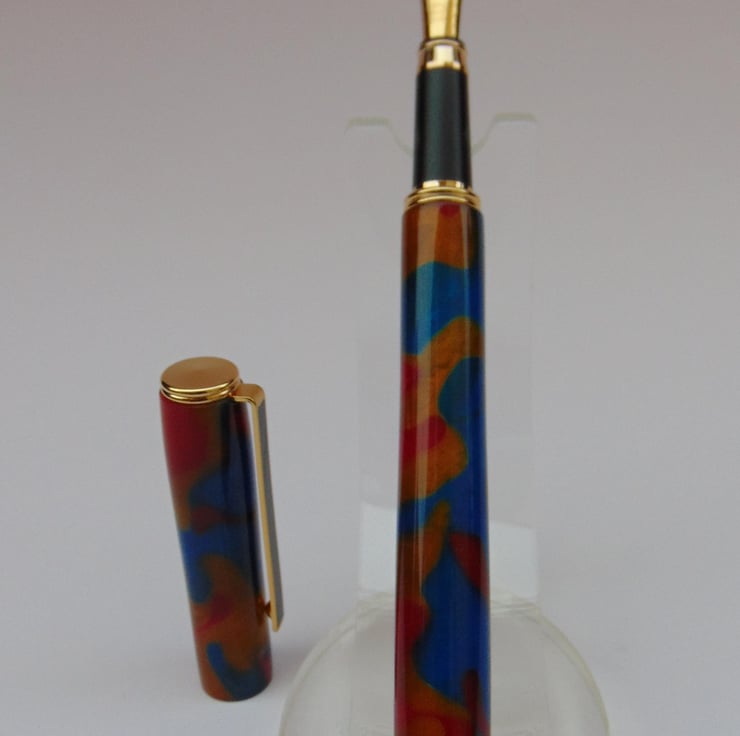 This fountain pen was manufactured using a Jazz Red acrylic blank. The blank is trimmed and turned, sanded and polished on a lathe prior to fitting the pen mechanism.