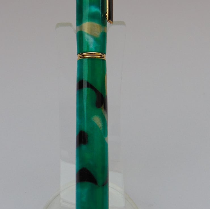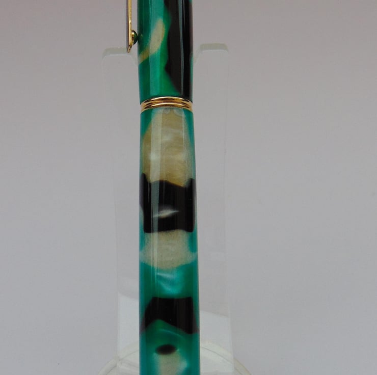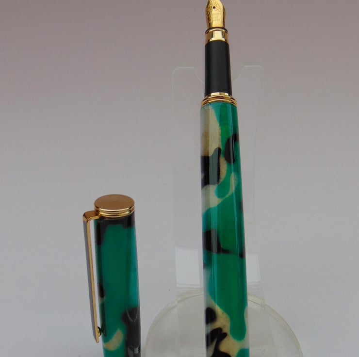 This fountain pen was manufactured using a Green Camo acrylic blank. The blank is trimmed and turned, sanded and polished on a lathe prior to fitting the pen mechanism.