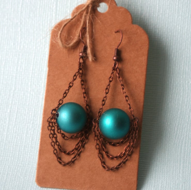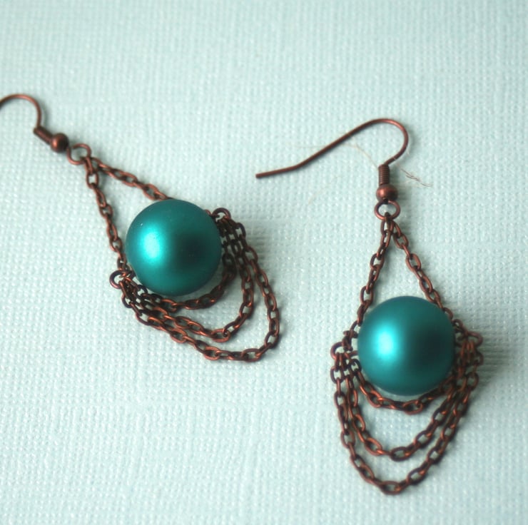 A dramatic pair of chandelier earrings made with shimmering emerald green round beads and layers of antique copper chain.