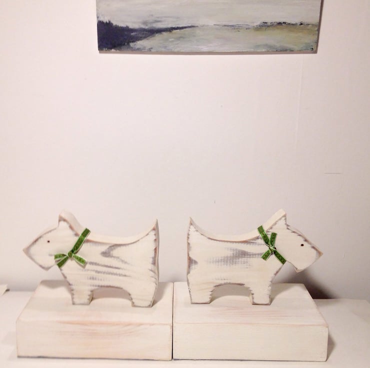Lovely bookends made using reclaimed wood which I source locally and then transform these bits of old wood into bookends, animals etc. These have a chunky base which are painted in Annie Sloan Chalk paints. A protective sealant is applied and felt is applied to the base to stop any damage to your surfaces and a ribbon is added to the dogs.