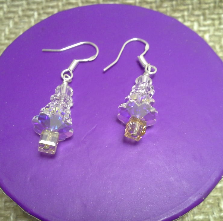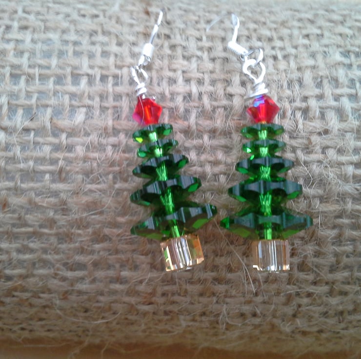 Swarovski Margarita crystals in four different sizes create the Christmas tree, a Swarovski cube crystal for the tub and a Swarovski bicone the "star". When these catch the light they sparkle beautifully. They are lightweight and are suspended on a sterling silver earwire. Just perfect for the festive season.
