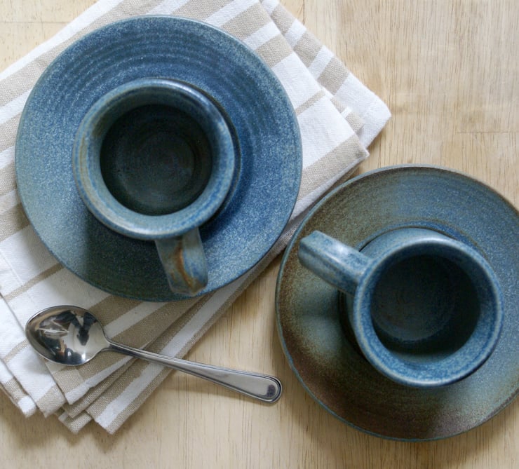 Throwing rings remain on each piece giving a gentle texture where my hands have drawn the clay upwards. The set also comes with two matching saucers, each one is gently curled to rest your spoon upon or have a sneaky biscuit!