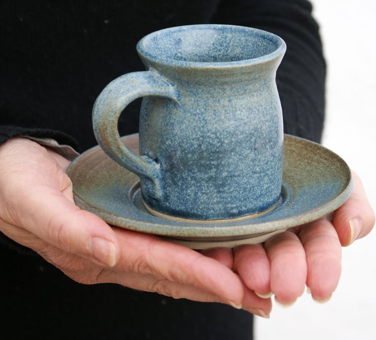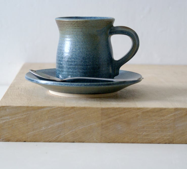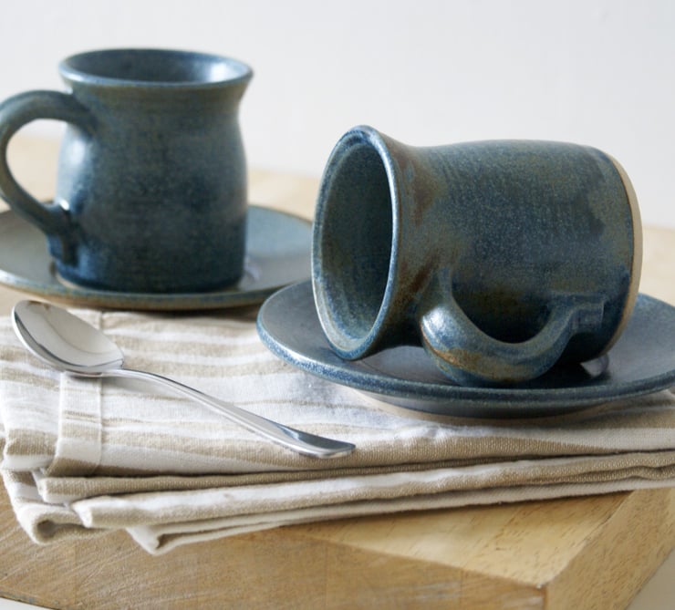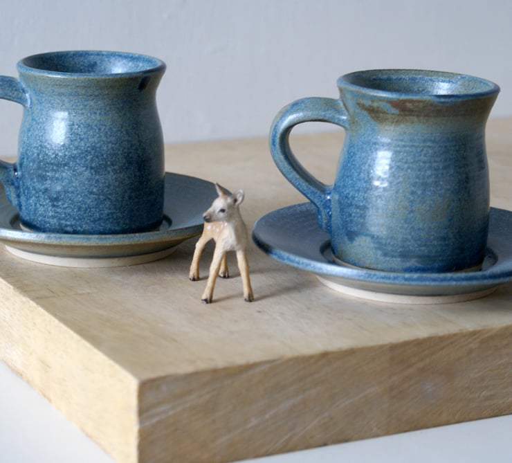 Two hand thrown espresso cups with saucers glazed in smokey blue. Handmade Stoneware Pottery by littlewrenpottery on Folksy.