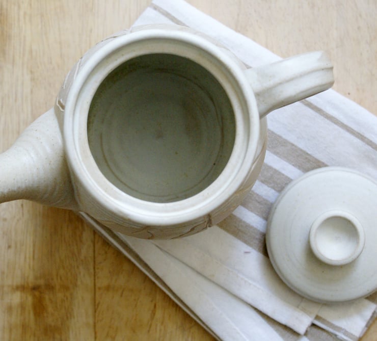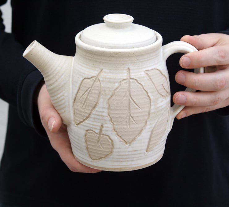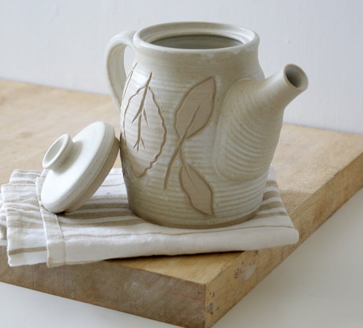 When all the pieces were firm enough I attached them together along with a sturdy pulled handle. The coffee pot is glazed in vanilla cream which has a soft off white tone and has a mat finish to the touch. The outside of the pot was also etched with a leaf pattern using real leaves as a template.