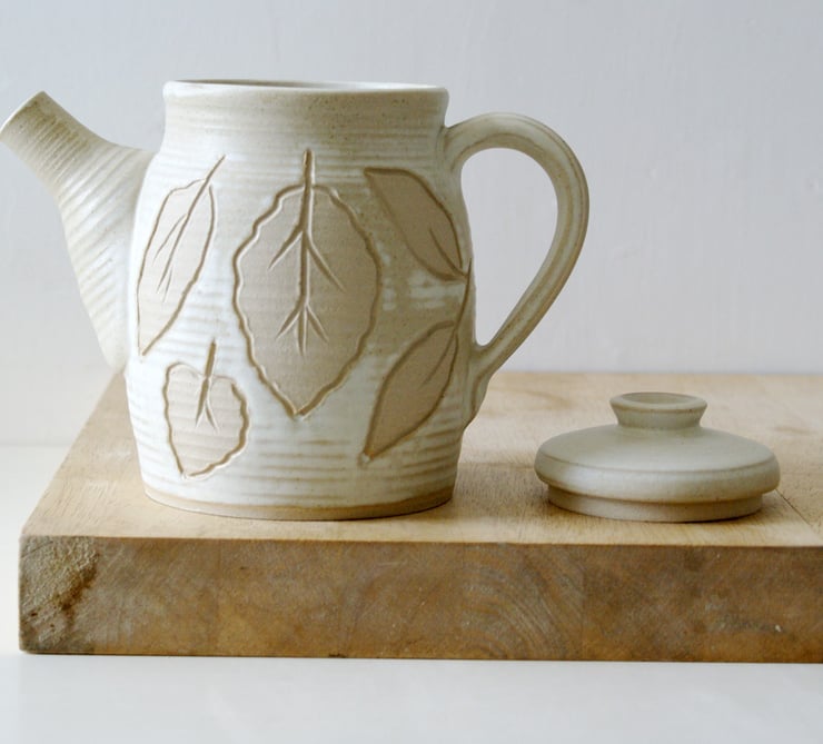 Hand thrown stoneware coffee pot - glazed in vanila cream with leaf pattern