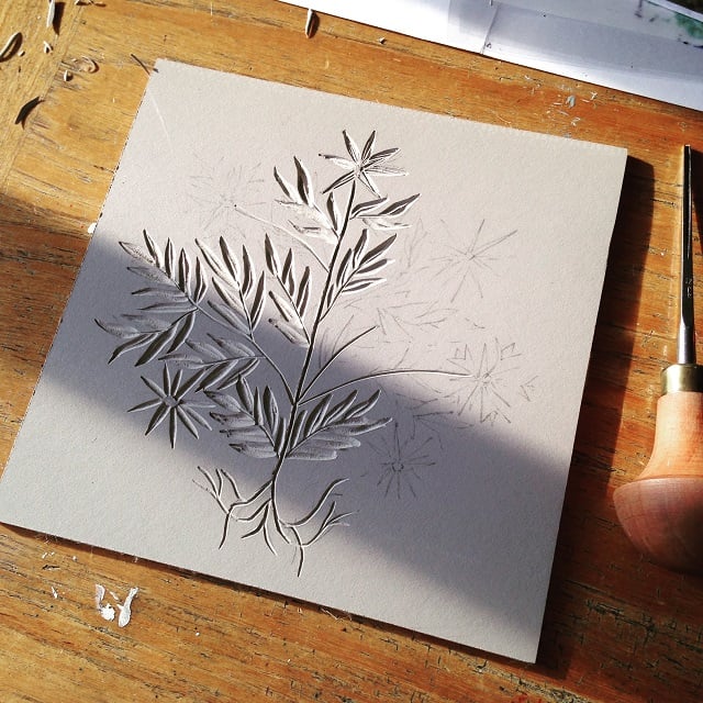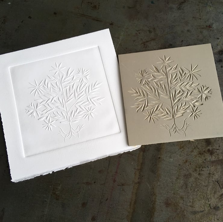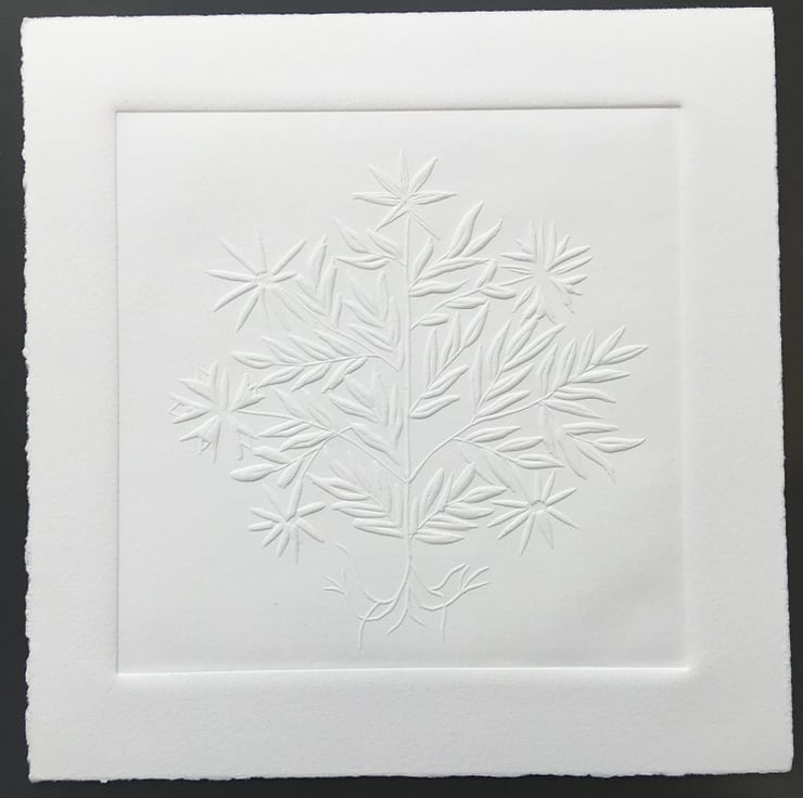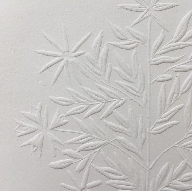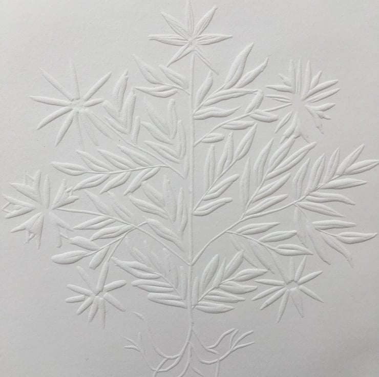 This 'Star Tree' print is inspired by an original Elizabethan ceiling in Powis Castle, Wales. I have carved the design into linoleum and then embossed the design onto top quality smooth Somerset Satin, white paper 300gms.