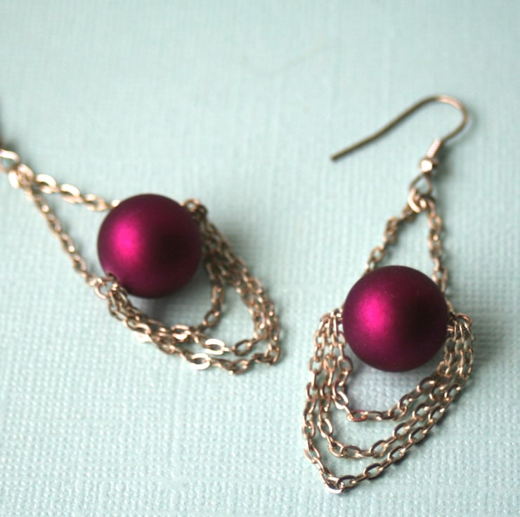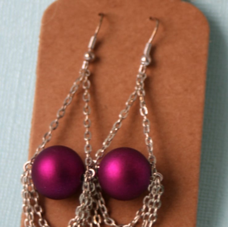 Chandelier earrings made with shimmering dark pink round beads and layers of silver plated chain.