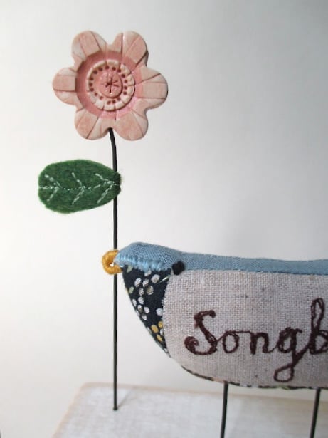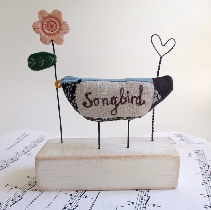 A hand crafted fabric songbird perching on a painted wood block, with a flower, leaf and a little twisted wire heart.