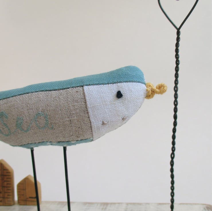 This sea bird has 'Sea' embroidered in green coloured cotton and a patchwork of patterned and plain cottons and linens make up it's soft body. It's beak and beady black eye are hand sewn with embroidery thread.