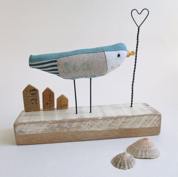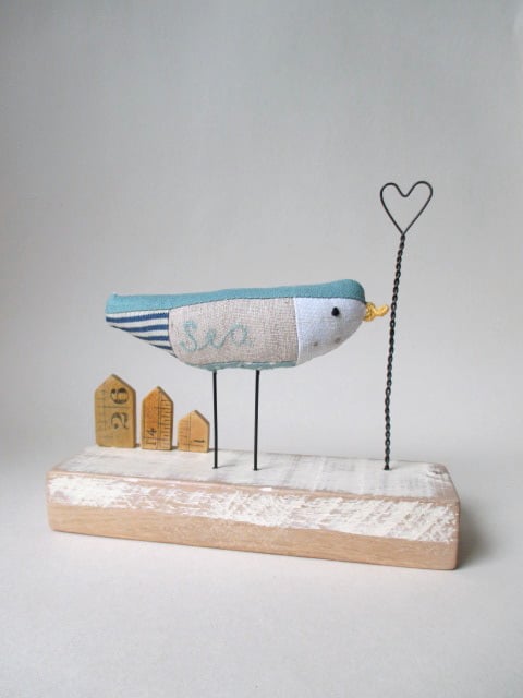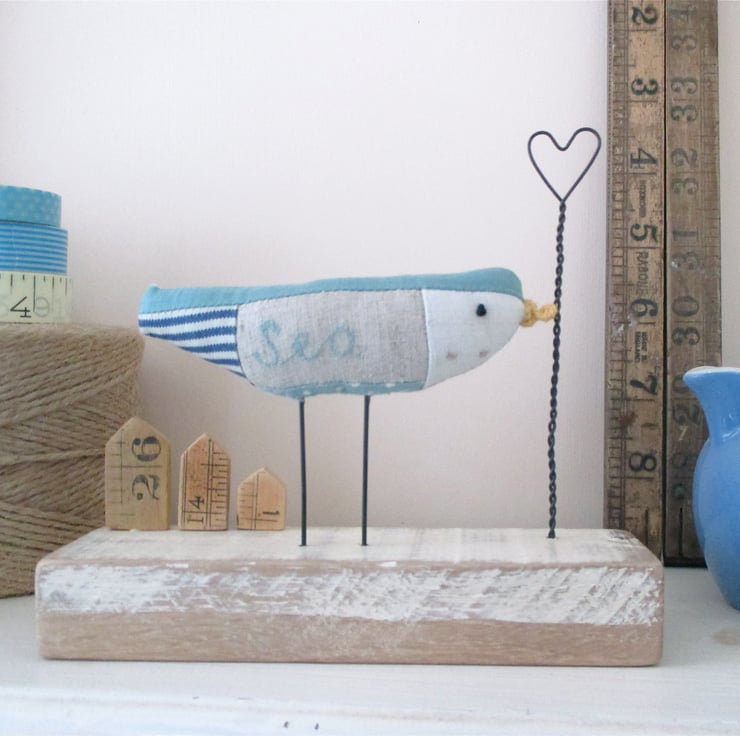 A hand crafted fabric sea bird perching on a painted wood block, with little sea huts and a wire heart.
