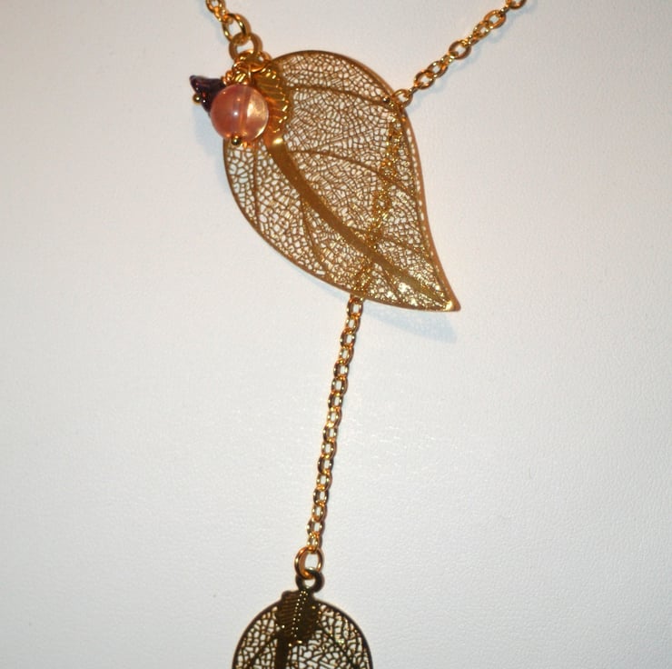 A very delicate necklace made with gold plated brass filigree leaves in two sizes on a gold plated trace chain. A cherry quartz round gemstone and a shimmering purple Czech glass flower add a feminine touch.
