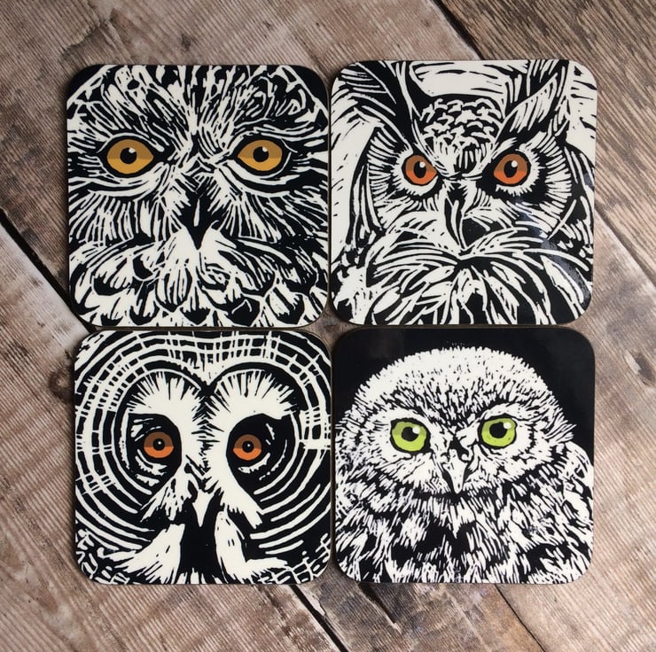 A set of four different owl coasters, to keep an eye on the drinks (and your tabletops!) Each coaster depicts a different owl: Great Grey Owl, Snowy Owl, Eagle Owl and a juvenile Little Owl. They are made from recycled hardboard with a glossy, wipeable surface and measure 9cm square. They will be tied with rustic string and presented in a clear cello pocket, a perfect gift for any bird lover. Sent winging their way to you in first class post within five days!