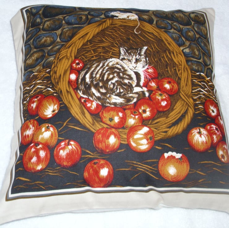 A square cushion of a brown Tabby cat curled up in a basket of red apples in a shed with a little mouse on top of the basket .lovely and soft cushion ,would look good in any lounge, sitting room, study or office on any settee or armchair or in a conservatory or summer house or on a bed.