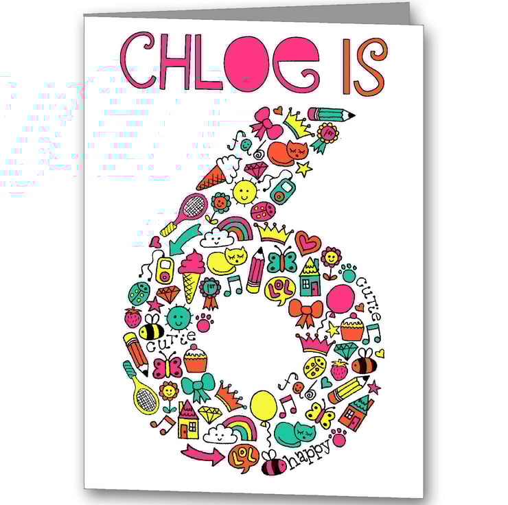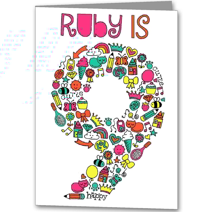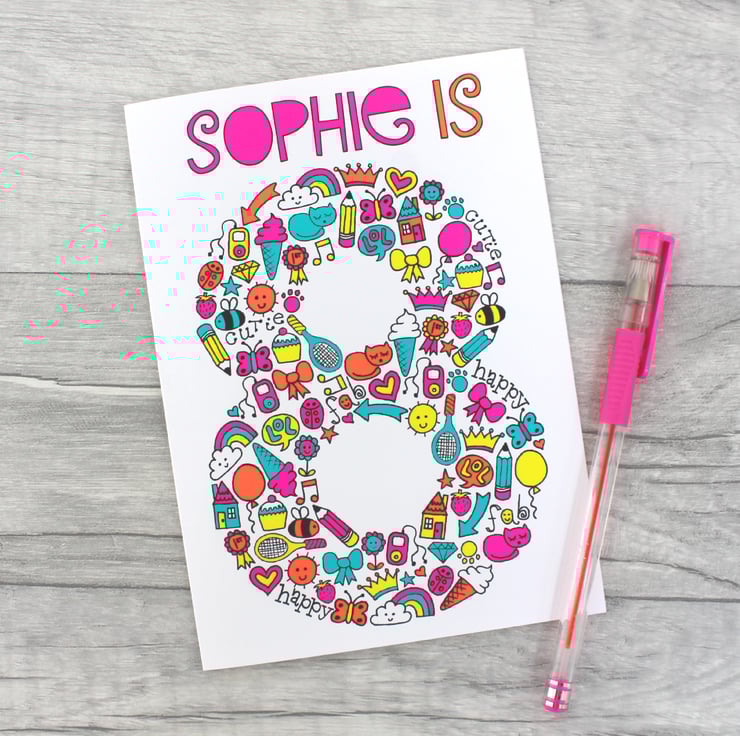 Make a girl's birthday extra special with her own personalised card. This card is inspired by all the things girls love! I design each card to order so it features the girl's own name and age. Kids love to see their name in print so it will be sure to make their day!