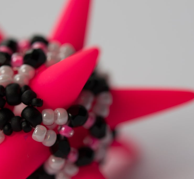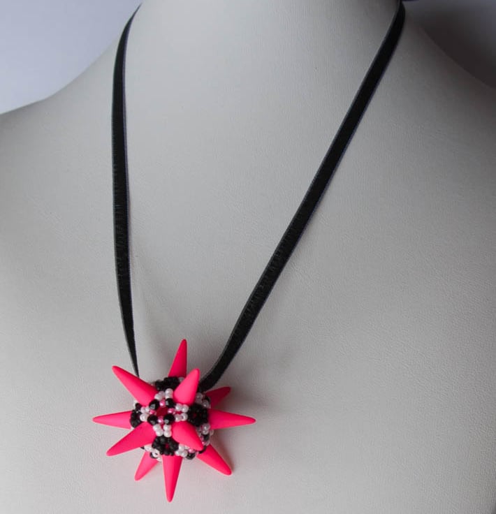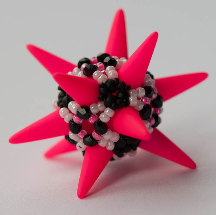 A wonderful exuberant ball of fluorescent matte pink Czech spike beads, held in place by a network of black, white and pink Miyuki seed beads and Czech fire polished beads. The beaded ball is hollow and self supporting, and is threaded onto a black and white ribbon.