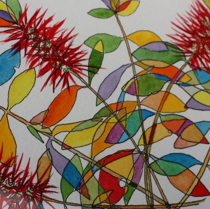 On holiday I love to sit and sketch. This Bottlebrush plant made a lovely subject to sketch in pen and then the water-colour was added whilst sipping a glass of wine in the evening -bliss :)