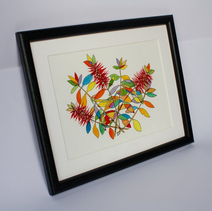 This is an original ink sketch,on high quality watercolour paper, of a lovely Bottlebrush plant growing in a garden in Crete. It has been finished with bright watercolours to create a sunny vibrant image and is presented with a white mount. The black frame measures 24 cm x 19 cm and contains plexiglass to reduce reflection. The picture is ready to hang.