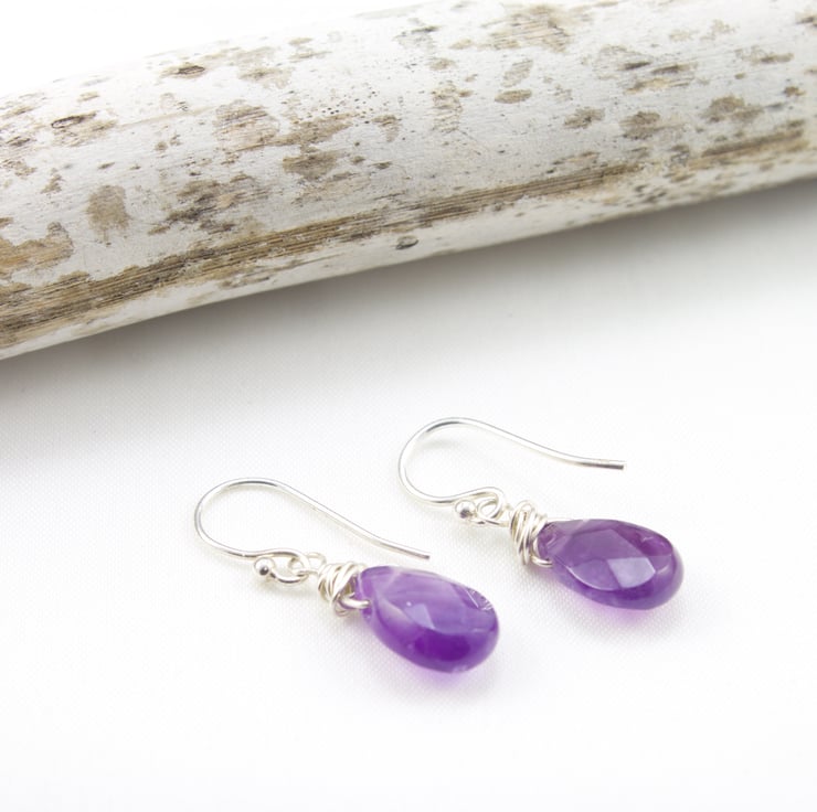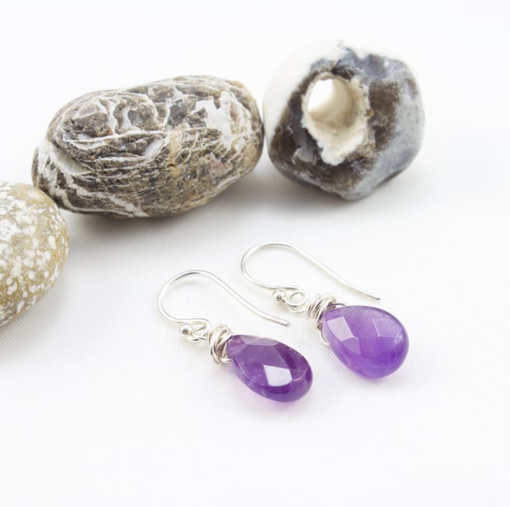 These pretty drop earrings have been handmade using faceted amethyst briolette beads which have been wire wrapped with sterling silver and are displayed on sterling silver ear wires.